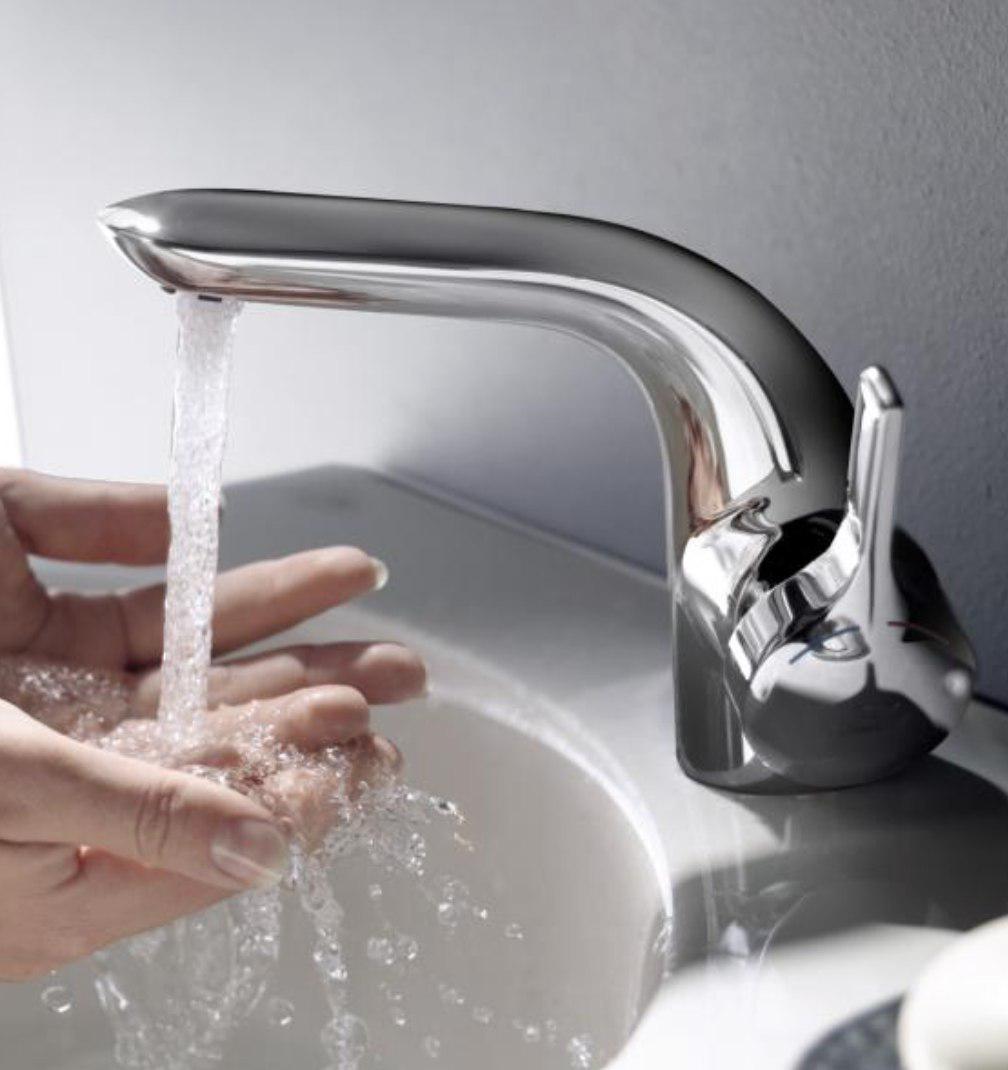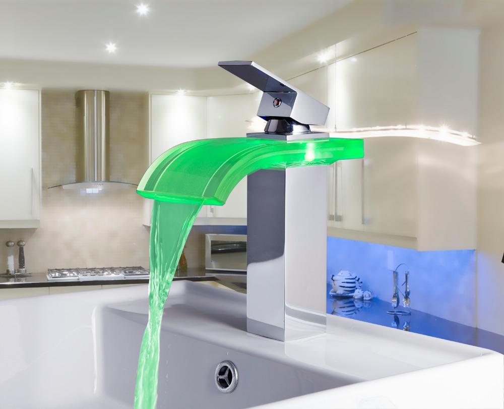 For baths and showers, mixer taps frequently incorporate some sort of pressure balancing feature so that the hot/cold mixture ratio will not be affected by transient changes in the pressure of one or other of the supplies. This helps avoid scalding or uncomfortable chilling as other water loads occur (such as the flushing of a toilet). Rather than two separate valves, mixer taps frequently use a single, more complex, valve controlled by a single handle (single handle mixer). The handle moves up and down to control the amount of water flow and from side to side to control the temperature of the water. Especially for baths and showers, the latest designs are thermostatic mixing valves that do this using a built-in thermostat, and can be mechanical or electronic. There are also faucets with color LEDs to show the temperature of the water